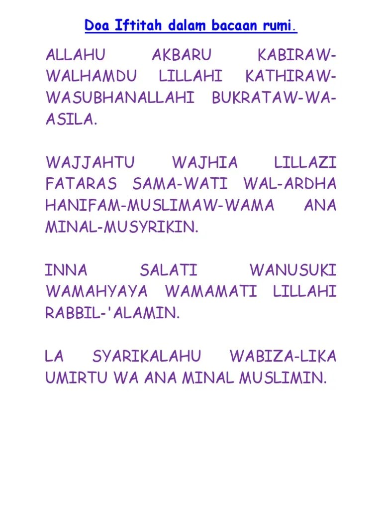Doa iftitah adalah doa yang dibaca dalam solat selepas mengangkat takbir dan sebelum membaca al . Doa iftitah dalam rumi dan maksudnya.